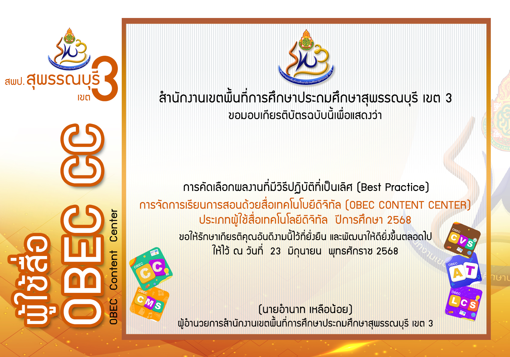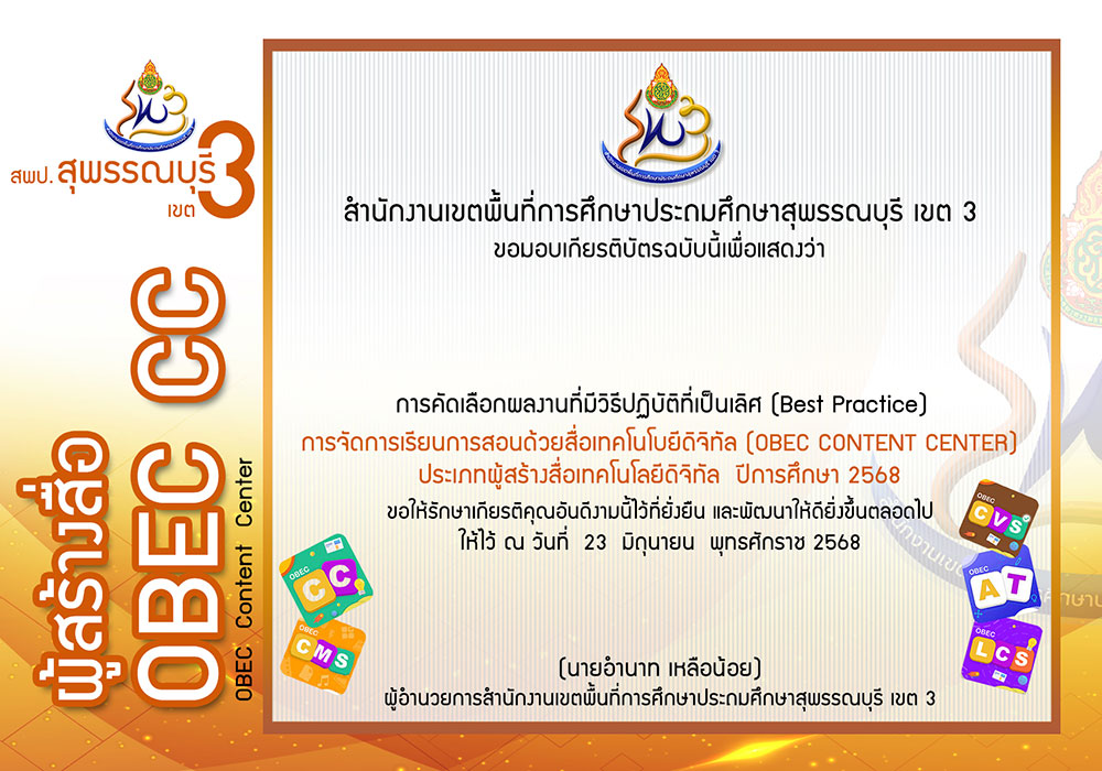 เกียรติบัตร Best Practices ผู้ใช้สื่อ OBEC Content Center ปีงบประมาณ พ.ศ.2568