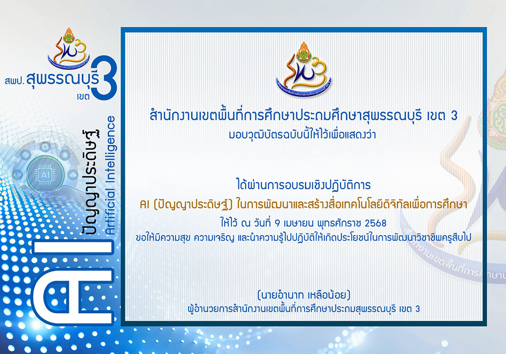 เกียรติบัตรและวุฒิบัตรการอบรมเชิงปฏิบัติการ AI (ปัญญาประดิษฐ์) ในการพัฒนาและสร้างสื่อเทคโนโลยีดิจิทัลเพื่อการศึกษา