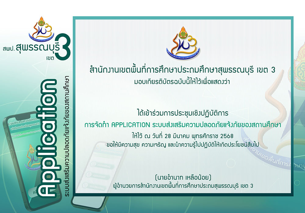 เกียรติบัตรการประชุมเชิงปฏิบัติการการจัดทำ Application ระบบส่งเสริมความปลอดภัยแจ้งภัยของสถานศึกษา