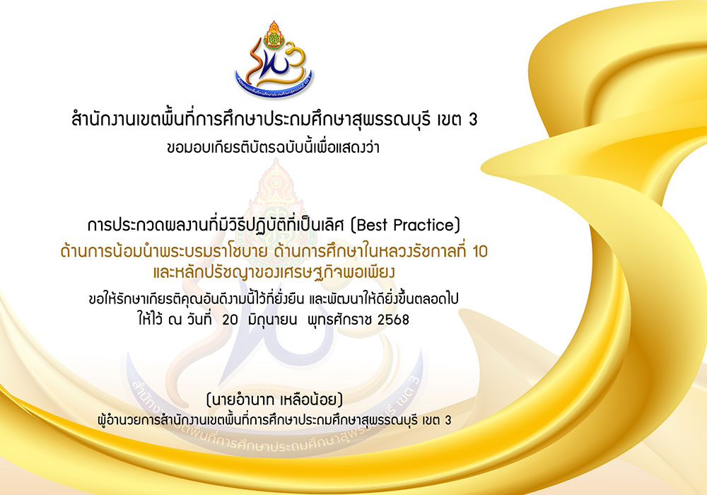 เกียรติบัตร Best Practices ด้านการน้อมนำพระบรมราโชบาย ด้านการศึกษาของในหลวงรัชกาลที่ 10 และหลักปรัชญาของเศรษฐกิจพอเพียง